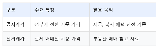 A: 공시가격은 세금이나 복지 혜택 같은 행정적인 기준을 위해 정해진 가격이고, 실제 거래 가격은 시장에서 사람들이 직접 사고팔면서 정해지는 가격이라 서로 차이가 있을 수 있어요. 정부는 이 차이를 줄이려고 노력하고 있답니다.